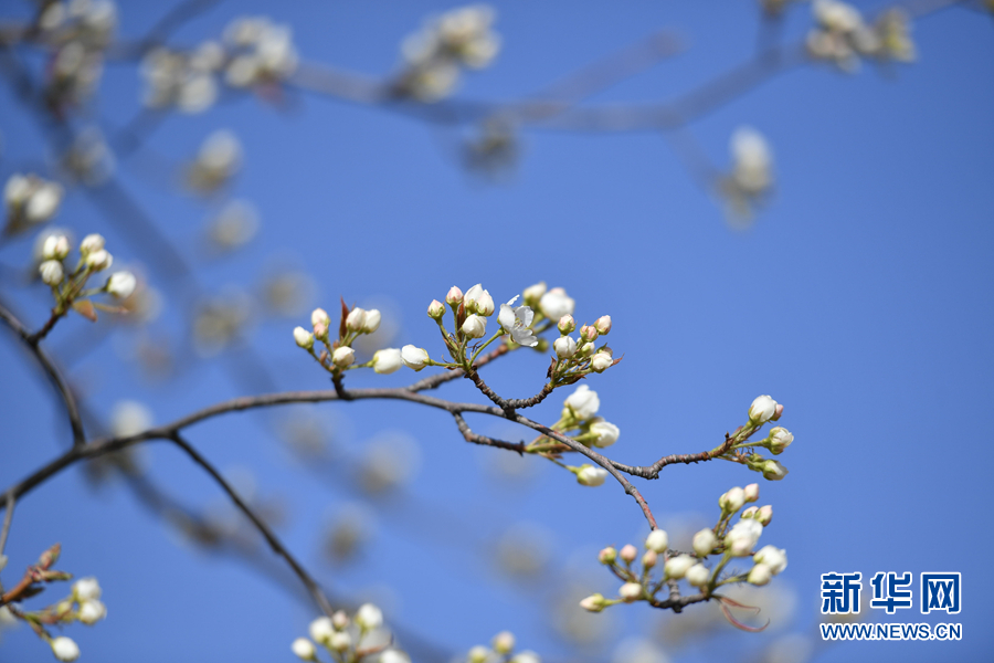 黃河岸畔的梨花迎春綻放。新華網(wǎng) 卡婭梅朵 攝