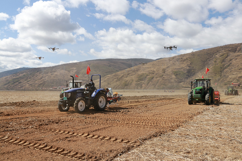 播種機、植保無人機等農(nóng)業(yè)機械各司其職、協(xié)同作戰(zhàn)。
