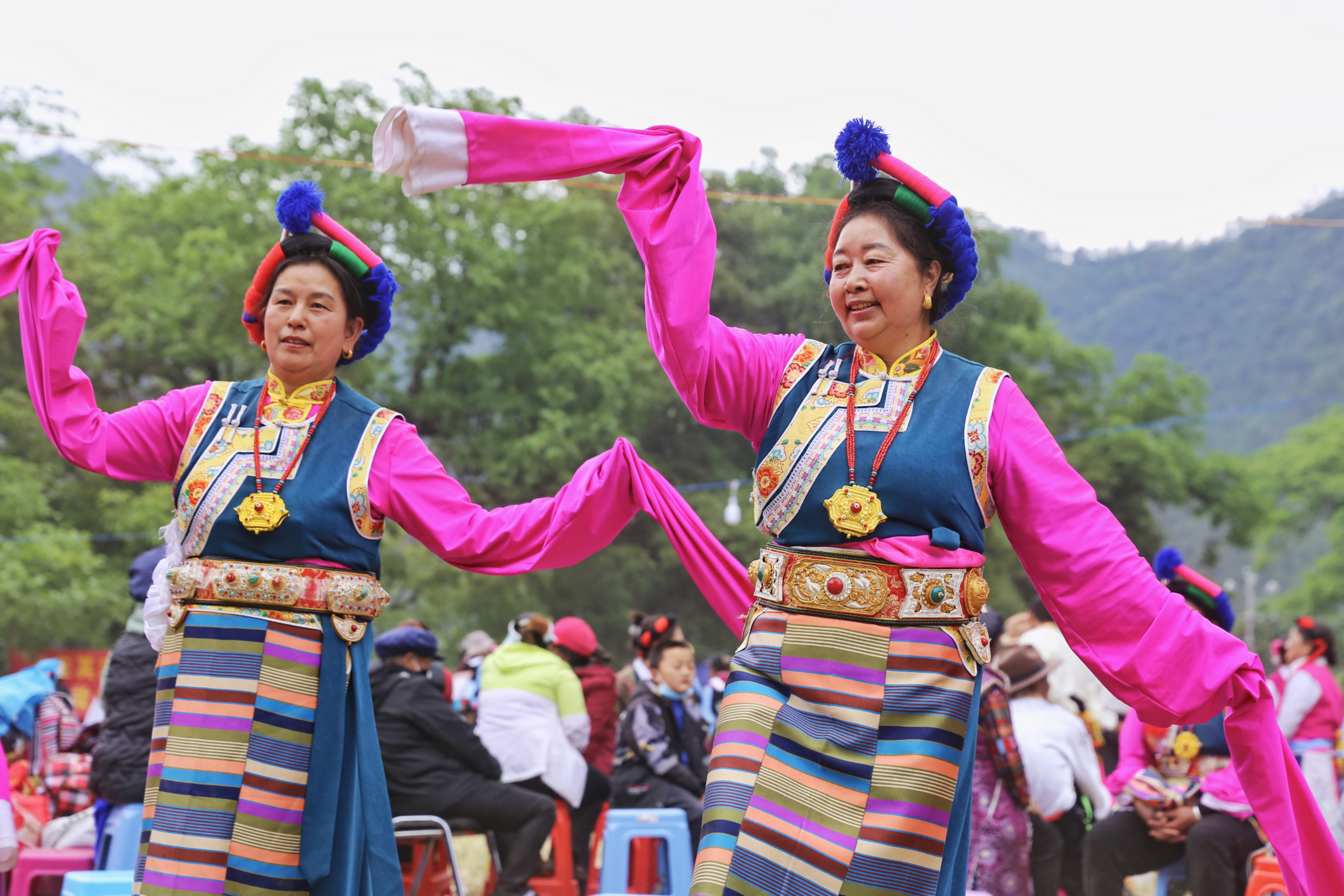 藝術(shù)節(jié)開幕式上,《最美的歌兒唱給黨》《傳統(tǒng)熱巴》《編雙草鞋送紅軍》《犁田調(diào)》《遇見卓瑪》等節(jié)目向觀眾展示了其宗厚重的文化底蘊和村民生活的變化。伴隨著悠揚的歌聲,“四縣”各族兒女手挽手、肩并肩,圍成同心圓共舞“千人鍋莊”,水袖揮舞,褶裙搖曳,場面壯觀,游客們紛紛拿出手機記錄這場視覺盛宴。