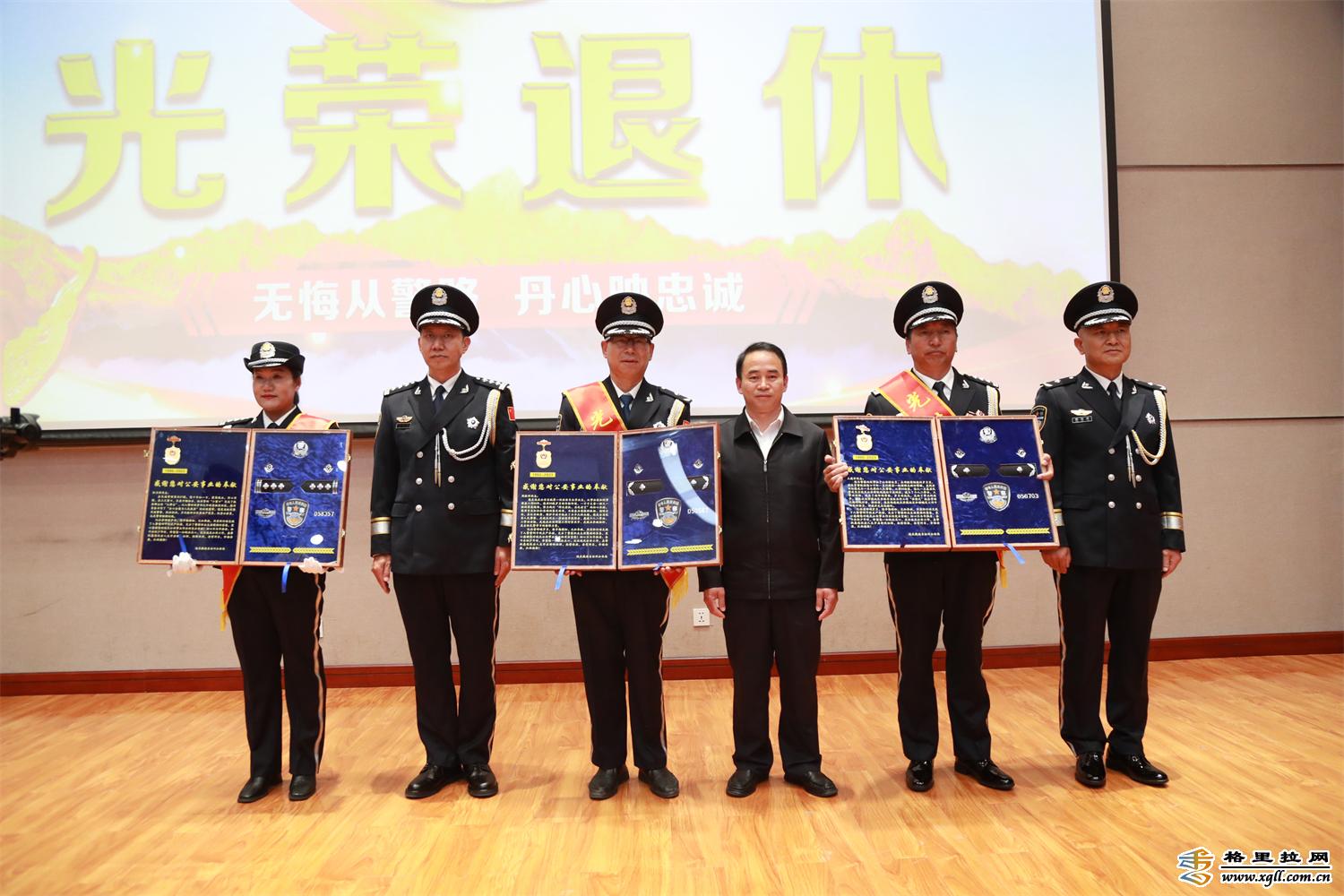 儀式上,迪慶州公安局相關(guān)領(lǐng)導(dǎo)為退休同志頒發(fā)了退休紀(jì)念章,還將退休民警各自的警徽、肩章等物品裝裱成冊贈與4位退休同志留作紀(jì)念。