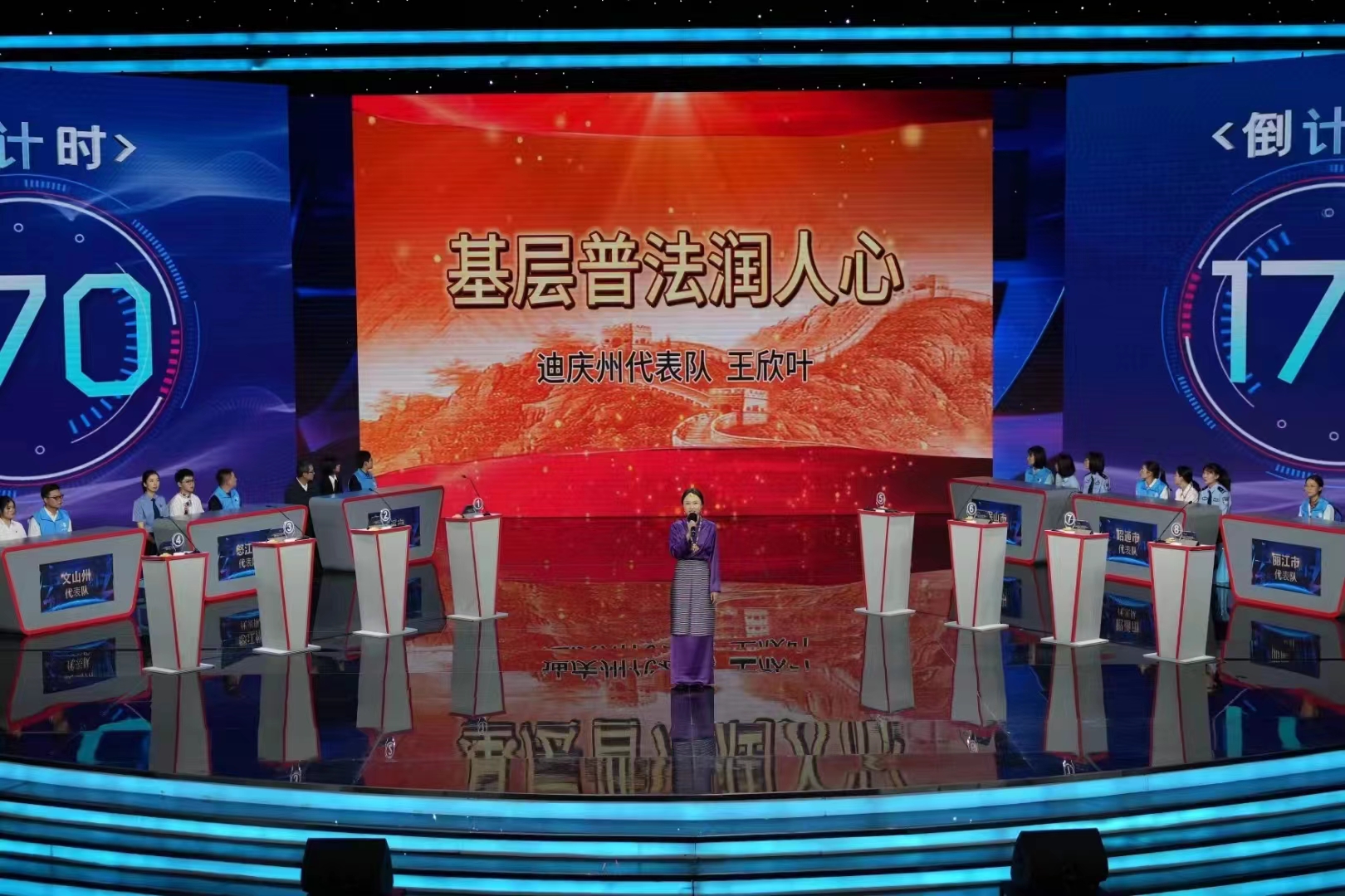 據(jù)悉,此次活動由云南省委宣傳部、省委政法委、省司法廳、省社科聯(lián)等11家單位主辦,將開展近300項重點活動,推進法治宣傳進農(nóng)村、進社區(qū)、進校園、進機關(guān)、進企業(yè)、進軍營、進網(wǎng)絡(luò)。此次“普法強基在行動·爭做法律明白人”全民學(xué)法大賽全省16個州市組隊參加,每支參賽隊由村(社區(qū))法律明白人、鄉(xiāng)鎮(zhèn)中小學(xué)教師、擔(dān)任鄉(xiāng)鎮(zhèn)中小學(xué)法治副校長的基層政法干警各1人組成。經(jīng)過各州市選拔賽和半決賽的激烈角逐,共決出8支隊伍進入電視總決賽。決賽包含必答題、挑戰(zhàn)答題、兩隊對戰(zhàn)、風(fēng)險題、演講賽五個環(huán)節(jié)。