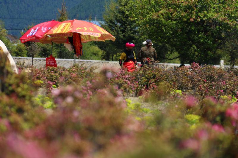 夏天,位于香格里拉市小中甸鎮(zhèn)的杜鵑花海競相綻放,紫色、粉色的花朵開成了海,與藍(lán)天白云遙相呼應(yīng),藏房點綴其間,美不勝收。每當(dāng)花季,當(dāng)?shù)氐睦习傩赵诨ê_厰[起特色美食,牦牛酸奶、苦蕎粑粑、酥油茶等美食供游客享用,坐在花海邊,品嘗當(dāng)?shù)靥厣朗?,是這個夏天小中甸花海獨(dú)有的浪漫。