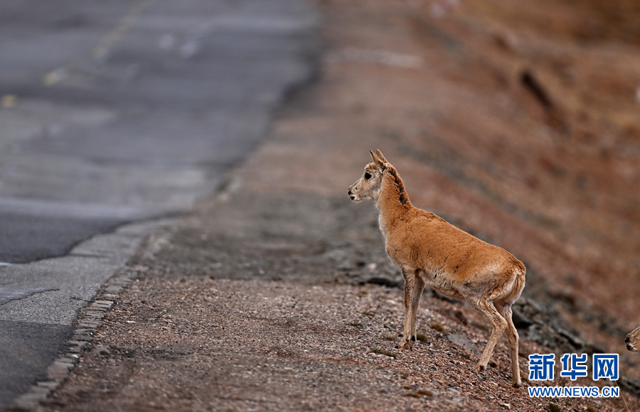 在青??煽晌骼?,一只雌性待產(chǎn)藏羚羊準(zhǔn)備通過青藏公路。新華網(wǎng) 潘彬彬 攝