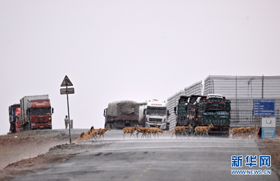 在青??煽晌骼铮蝗捍菩源a(chǎn)藏羚羊通過青藏公路。新華社記者 薛玉斌 攝