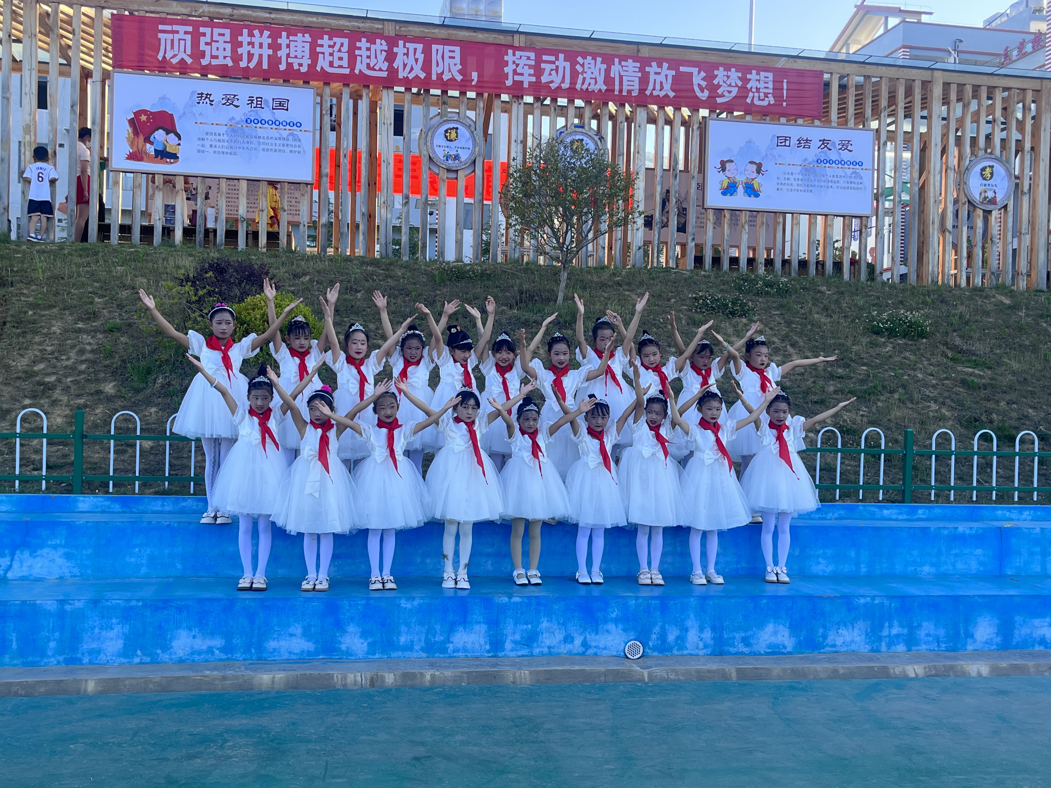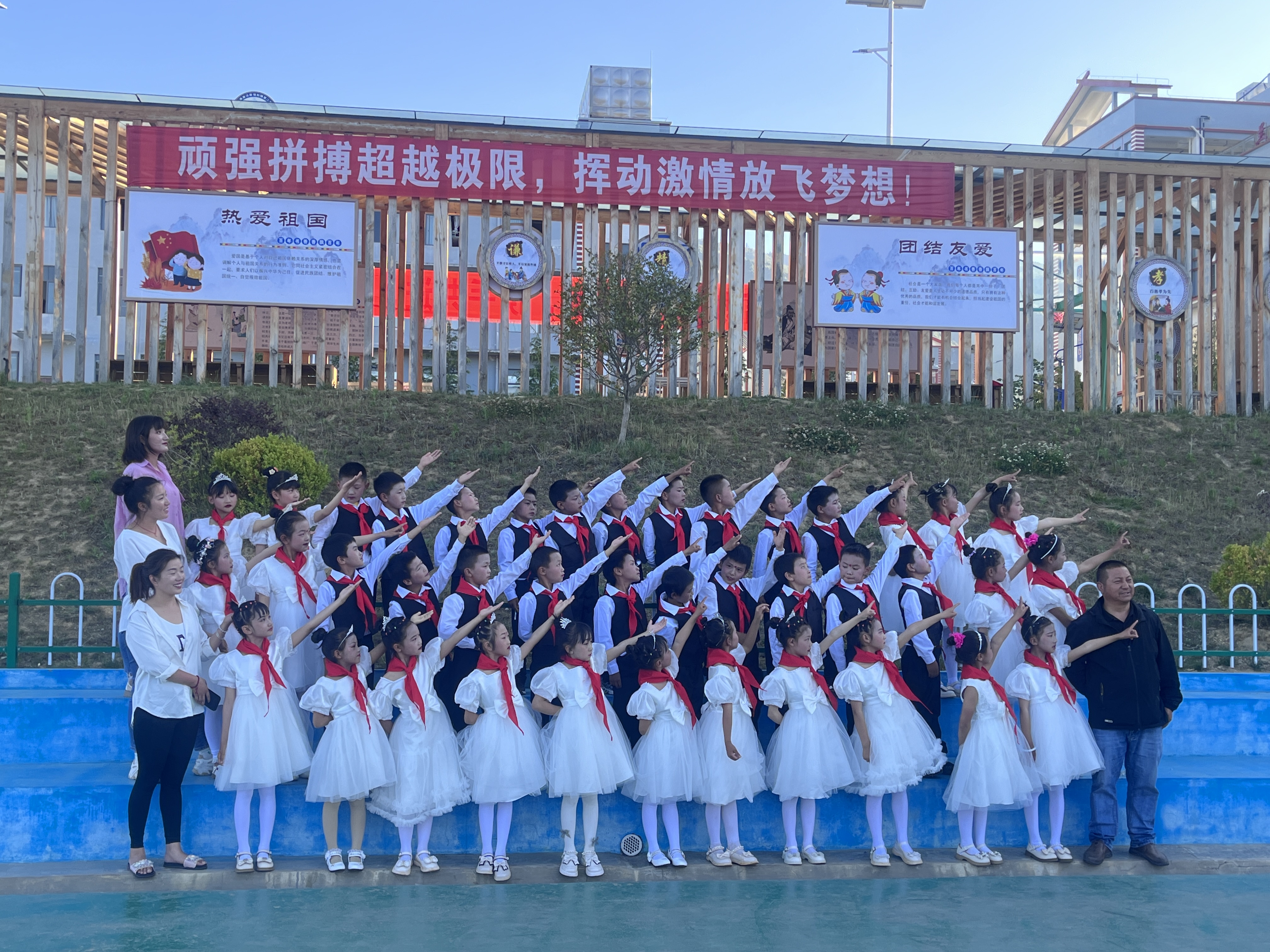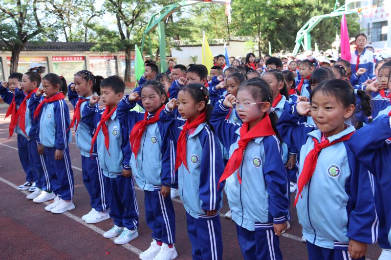 上午8點(diǎn)30分,活動正式開始,升國旗、唱國歌、行隊(duì)禮,孩子們激動的心情溢于言表。在新隊(duì)員入隊(duì)儀式上,共有138名學(xué)生加入光榮的中國少年先鋒隊(duì)組織,老隊(duì)員們?yōu)樗麄兣宕骷t領(lǐng)巾,鮮艷的紅領(lǐng)巾在新隊(duì)員的胸前飄揚(yáng),也在燦爛的朝陽下熠熠閃光。隨后,該校對獲得“2022—2023年度“優(yōu)秀少先隊(duì)員”“優(yōu)秀班干部”“紅領(lǐng)巾一星獎?wù)聵s譽(yù)”的同學(xué)進(jìn)行了表彰。最后,學(xué)校舞蹈社團(tuán)的孩子們?yōu)榇蠹規(guī)砭实母栉璞硌?,把整個活動推向高潮。 (張燕 攝影報道)