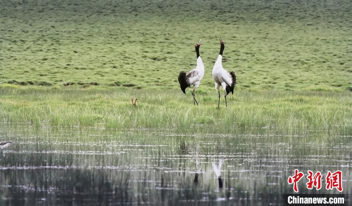 圖為黑頸鶴在青海境內(nèi)濕地內(nèi)棲息。祁連山國家公園青海省管理局供圖