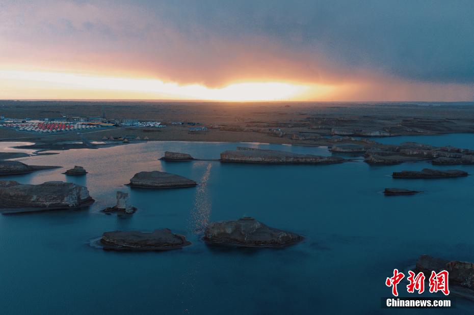 6月24日,清晨的降雨過后,青海省海西蒙古族藏族自治州大柴旦烏素特(水上)雅丹天空澄碧,纖云不染,太陽緩緩上升,給天邊鑲嵌了一條金邊,與烏素特(水上)雅丹遙相輝映,風光旖旎。