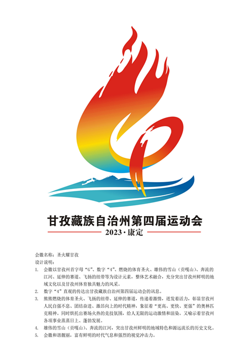據(jù)了解,甘孜州第四屆運動會會徽征集工作自2023年3月7日啟動以來,全國各地、社會各界人士積極響應(yīng),踴躍投稿,截至2023年4月30日24時,共收到應(yīng)征者會徽投稿作品8件。經(jīng)賽事組委會辦公室組織專家多輪評選,由評審委員會審定,來自山東省濟南市的設(shè)計師王拓進所設(shè)計的《圣火耀甘孜》入選。