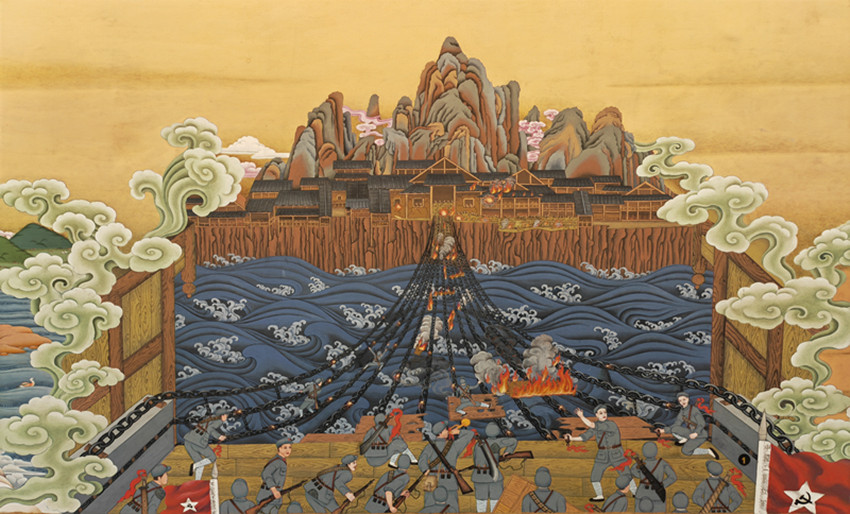 巨幅唐卡《紅星照耀雪域》中的飛奪瀘定橋場景。