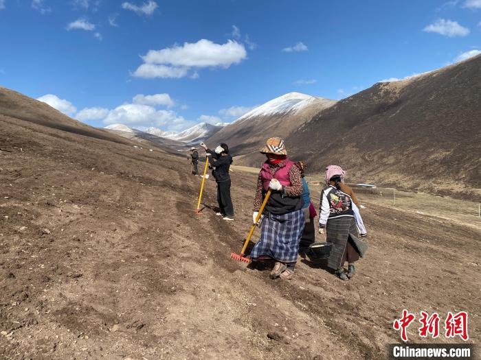 “土壤、植物和動物共同組成了完整的‘地球肌膚’系統(tǒng),恢復黑土灘需要針對不同生態(tài)層次進行科學治理?!迸砜榻B,本次修復在今年四月進行,首先針對土壤進行淺刨溝、坡向垂直橫向條播,為播種創(chuàng)造合適的土壤條件,再選用披堿草、老芒麥、中華羊茅、冷地早熟禾、星星草、燕麥、紫羊茅7種本地草種,進行比例混合,再為種子覆土,以有利于保持種子不被風吹、流失和鳥類“偷吃”,穩(wěn)定恢復植被生長。