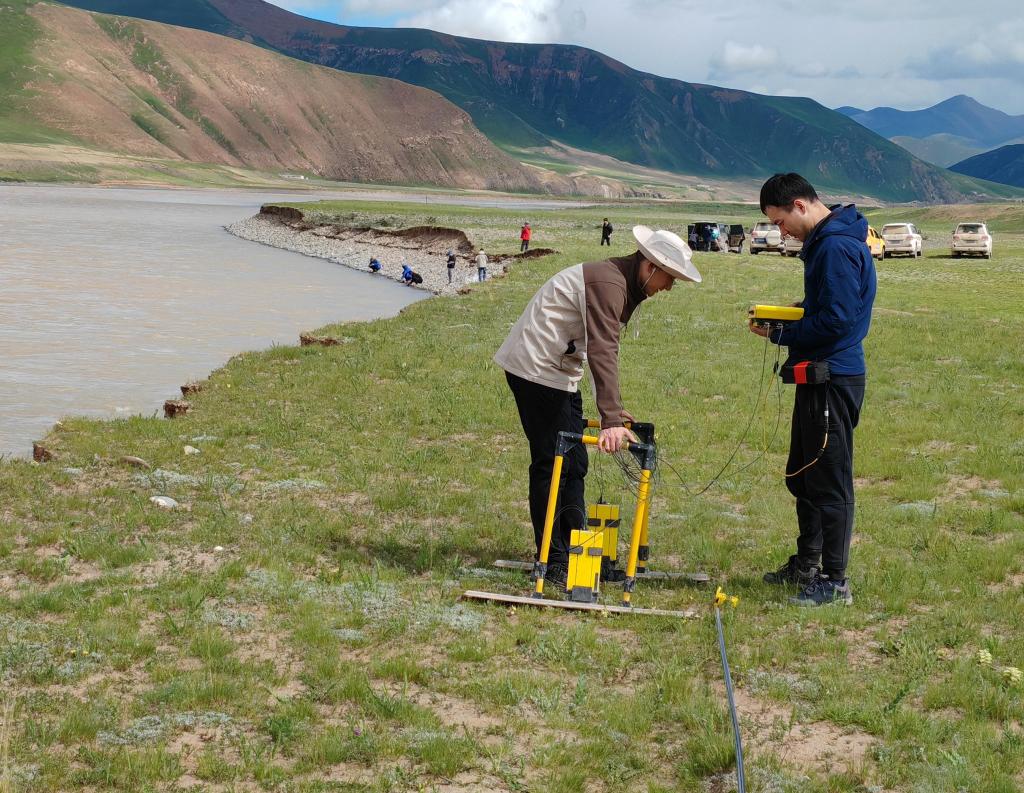 7月25日,范越(前左)和董士琦在長(zhǎng)江上游干流通天河畔開(kāi)展地質(zhì)雷達(dá)探測(cè)。(受訪者供圖)