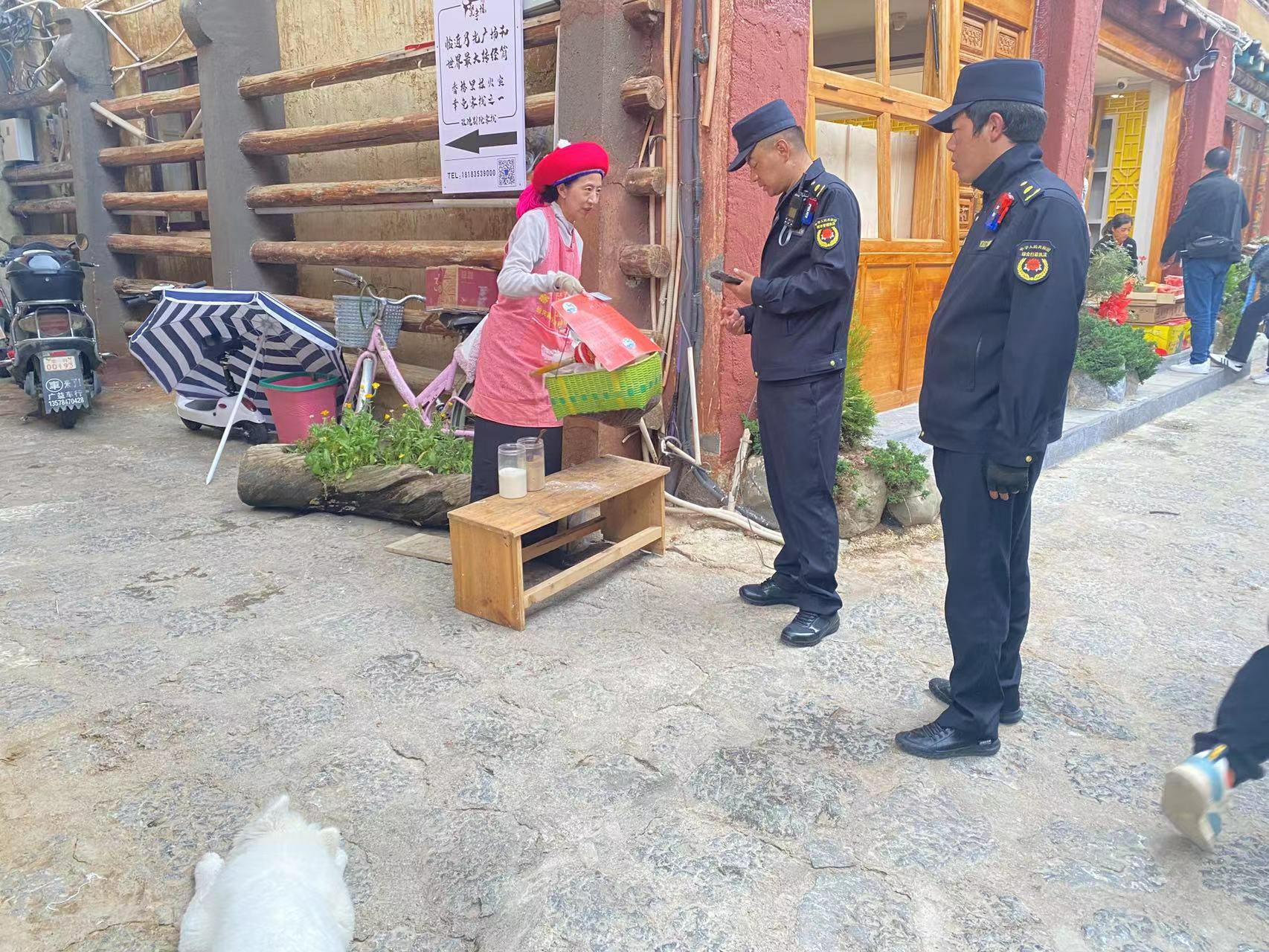 整治過程中,綜合行政執(zhí)法人員全天候無縫巡查,重點對出店經(jīng)營、占道經(jīng)營、亂停亂放、流動攤販無序擺攤等問題進行整治。排查月光廣場等公共區(qū)域擺攤?cè)藛T,凡屬古城內(nèi)商戶的一律要求返回店內(nèi)買賣;屬于流動攤販的及時引導至劃定的攤位;對古城內(nèi)所有亂停亂放的機動車和非機動車,及時找到使用人,要求停放至指定區(qū)域,確保游客出行更加方便,市容更加整潔有序。圖為綜合行政執(zhí)法人員在勸導占道經(jīng)營攤點。