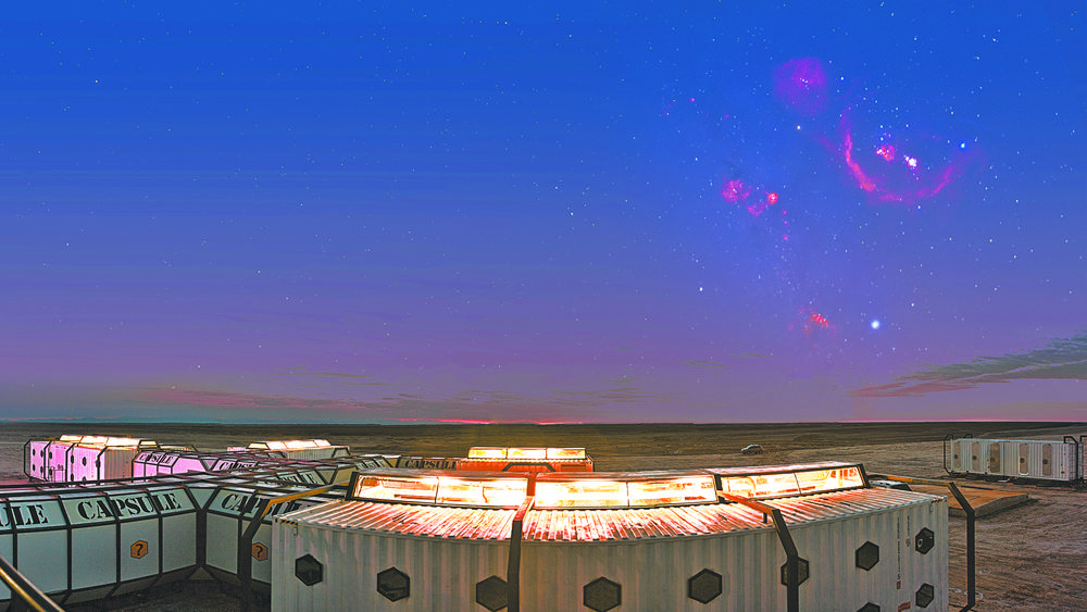 “我們的建筑風(fēng)格是模擬未來人類移居火星后的生存環(huán)境,有‘總部大樓’‘火星艙’等?!表樦衩袷种傅姆较?,才發(fā)現(xiàn),原來那些白色集裝箱正是營地建筑的主體。