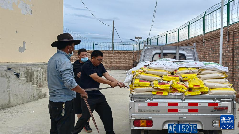 2022年8月17日,鄧官杰(左三)為同德縣唐谷鎮(zhèn)受災(zāi)群眾搬運(yùn)應(yīng)急物資。同德縣應(yīng)急管理局供圖