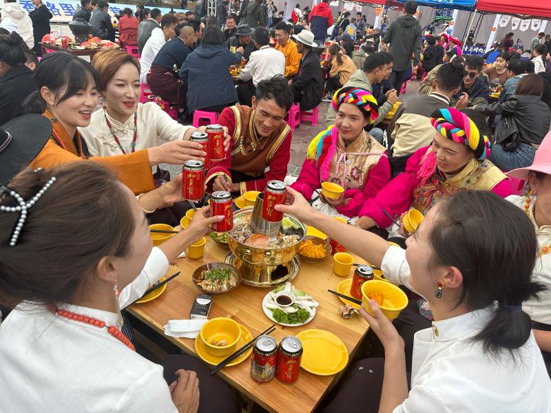 8月25日傍晚,香格里拉松茸美食節(jié)美食長(zhǎng)街宴在獨(dú)克宗古城月光廣場(chǎng)舉辦。熱鬧喜慶的長(zhǎng)街宴上,松茸刺身、牦牛肉、藏式火鍋等美食引來(lái)食客大快朵頤。
