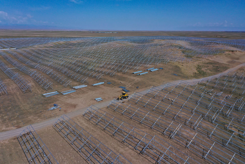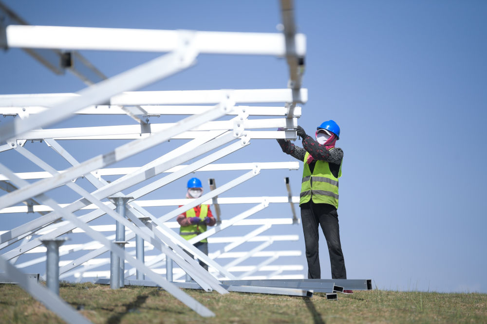 2022年6月8日,工人在黃河上游水電開發(fā)有限責(zé)任公司海南基地共和縣100萬(wàn)千瓦光伏項(xiàng)目施工。新華社記者 張龍 攝