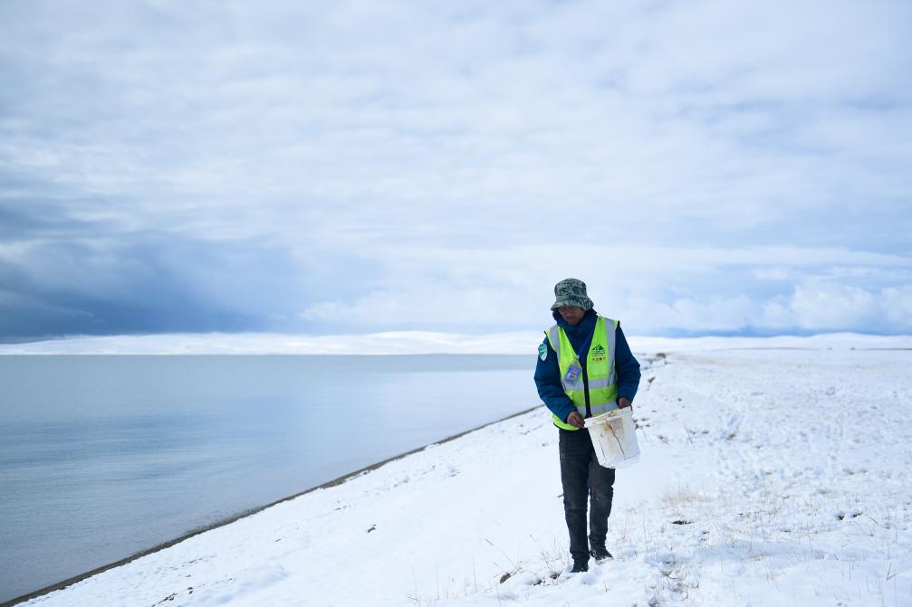 2021年10月20日,在青海省果洛藏族自治州瑪多縣扎陵湖鄉(xiāng)勒那村,三江源國家公園黃河源園區(qū)生態(tài)管護(hù)員在扎陵湖邊撿拾垃圾。新華社記者張龍 攝