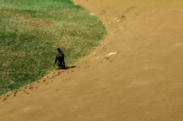 拼版照片:上圖為2002年參與防治沙漠化的工作人員在瑪曲縣黃河沿岸一處沙化草場上壓沙(新華社記者 韓傳號 攝);下圖為2023年7月6日,牧民在瑪曲縣黃河沿岸一處沙化草原治理點進行草籽補種工作(新華社記者 張可任 攝)。