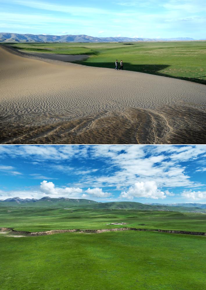 拼版照片:上圖為2011年6月9日,兩名技術(shù)人員在甘南藏族自治州瑪曲縣歐拉鄉(xiāng)歐強村查看草場沙化退化情況,這里已經(jīng)成為當時瑪曲草原沙化最為嚴重的草場之一(新華社記者 聶建江 攝);下圖為2023年7月6日在甘南藏族自治州瑪曲縣歐拉鎮(zhèn)歐強村境內(nèi)拍攝的經(jīng)過治理修復(fù)的草原(新華社記者 陳斌 攝)。