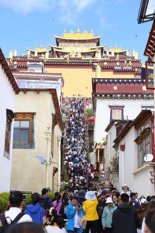 “看到松贊林寺全景感覺很雄偉、莊重,我們還穿了當(dāng)?shù)氐牟胤牧艘恍懻妫杏X很漂亮,也比較出片。”來自山東的羅云女士說,“我們進景區(qū)的時候已經(jīng)中午12點多了,工作人員都一直沒有休息,還耐心地引導(dǎo)和服務(wù)我們,感覺很溫馨”。據(jù)了解,假期前三日,松贊林景區(qū)游客接待量不斷上升,分別為4300人次、8200人次、14400人次。