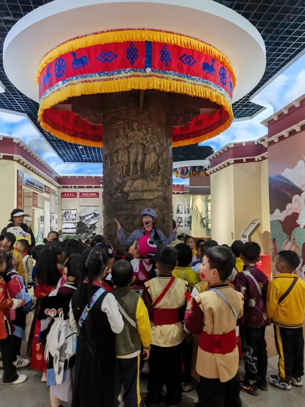展館內(nèi),“格?;ㄐ⌒≈v解員”進(jìn)行著生動(dòng)地講解,通過一件件文物、一幅幅圖片、一個(gè)個(gè)互動(dòng)景觀訴說雪域高原上的紅色歷史,引導(dǎo)小朋友們體悟那段不平凡的崢嶸歲月,在行走的課堂里收獲知識(shí)和成長。