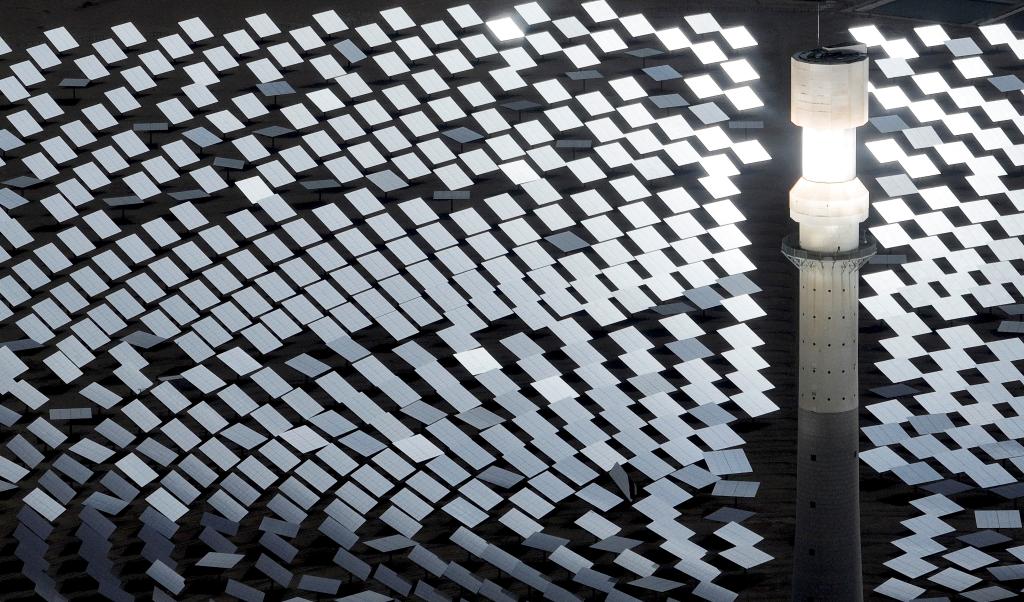 蔚藍色的光伏板在陽光照射下熠熠生輝,光能便轉(zhuǎn)化成源源不斷的電能;風力發(fā)電機的葉片迎風飛轉(zhuǎn),風被“捕捉”進一條條輸電線;百米高的吸熱塔和“鏡子海洋”組成熔鹽塔式光熱電站,科技感與綠色減碳有機結(jié)合……