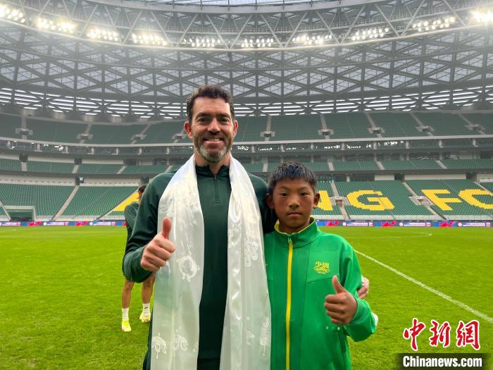 圖為玉樹足球少年尕瑪龍周與北京國(guó)安隊(duì)主教練里卡多·蘇亞雷斯合影。旦周尼瑪 攝