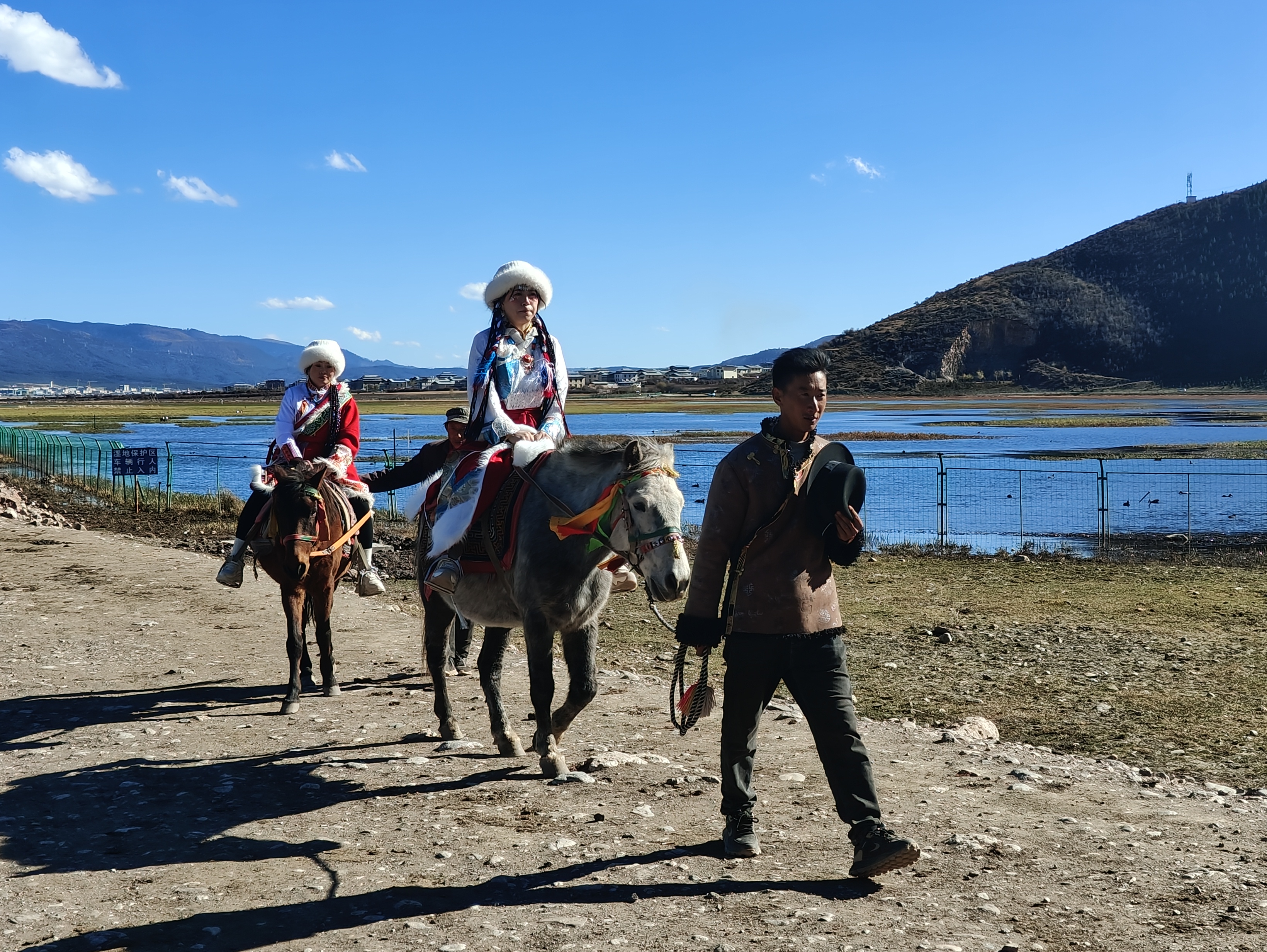 進入11月,迪慶的氣溫雖然持續(xù)下降,但并不影響游客們的游玩熱情。納帕海陽光明媚、碧波蕩漾,不少游客選擇到納帕海環(huán)湖游,騎行的、騎馬的、賞景的、拍照的游客絡(luò)繹不絕。圖為游客在納帕海濕地騎馬,體驗藏族馬背文化魅力。