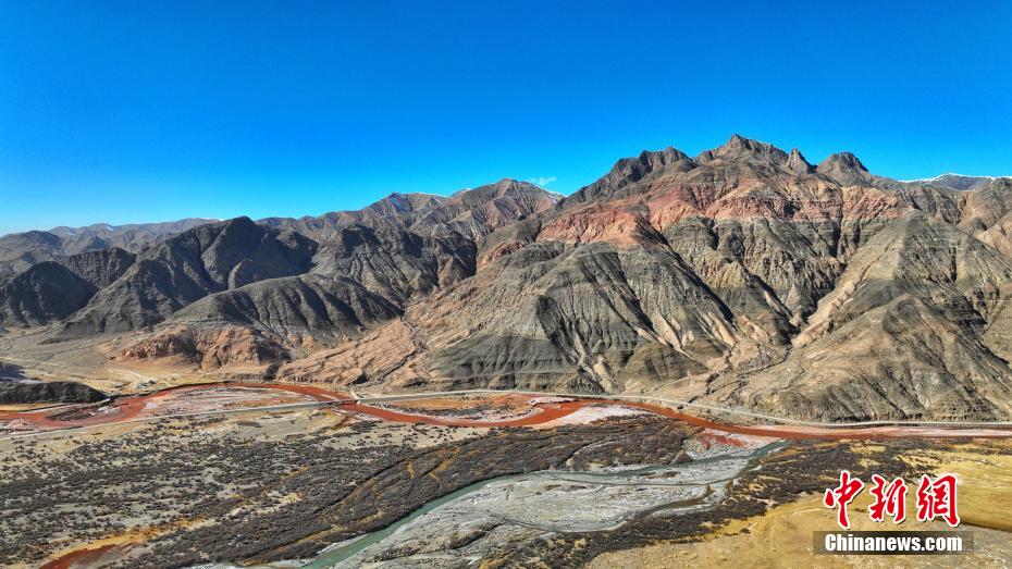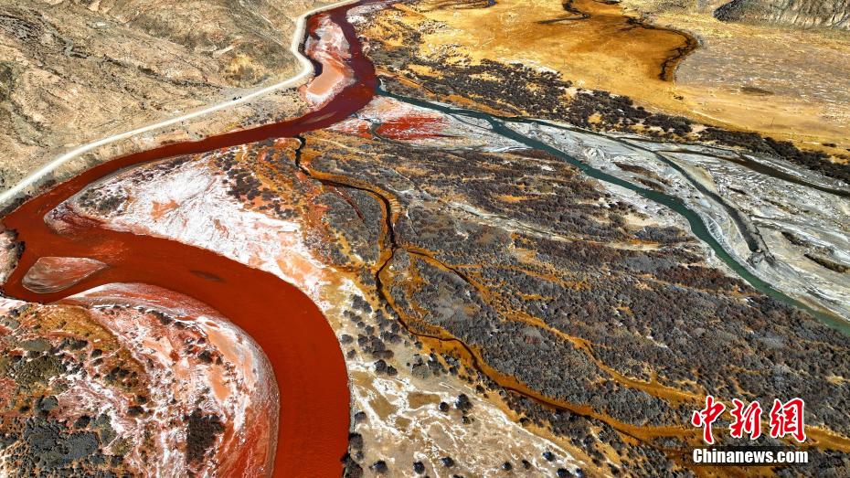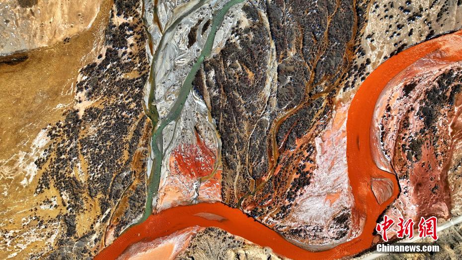 11月寒冬,攝影愛好者在地處柴達(dá)木盆地的青海省海西蒙古族藏族自治州都蘭縣香日德香加鄉(xiāng),航拍香日德河。鏡頭之下,香日德河河床寬大,水量充沛,因夾帶大量紅色泥沙,使得河水變成了混濁的紅色,當(dāng)?shù)厝罕娙∶小盀跆m烏蘇”,意為紅色的河水。從空中俯瞰,整個(gè)水系似“大地血脈”。