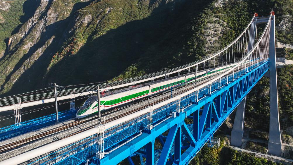 圖為11月9日,麗香鐵路動態(tài)檢測期間,復(fù)興號列車駛過虎跳峽金沙江鐵路大橋。(中國鐵路昆明局集團(tuán)公司供圖)