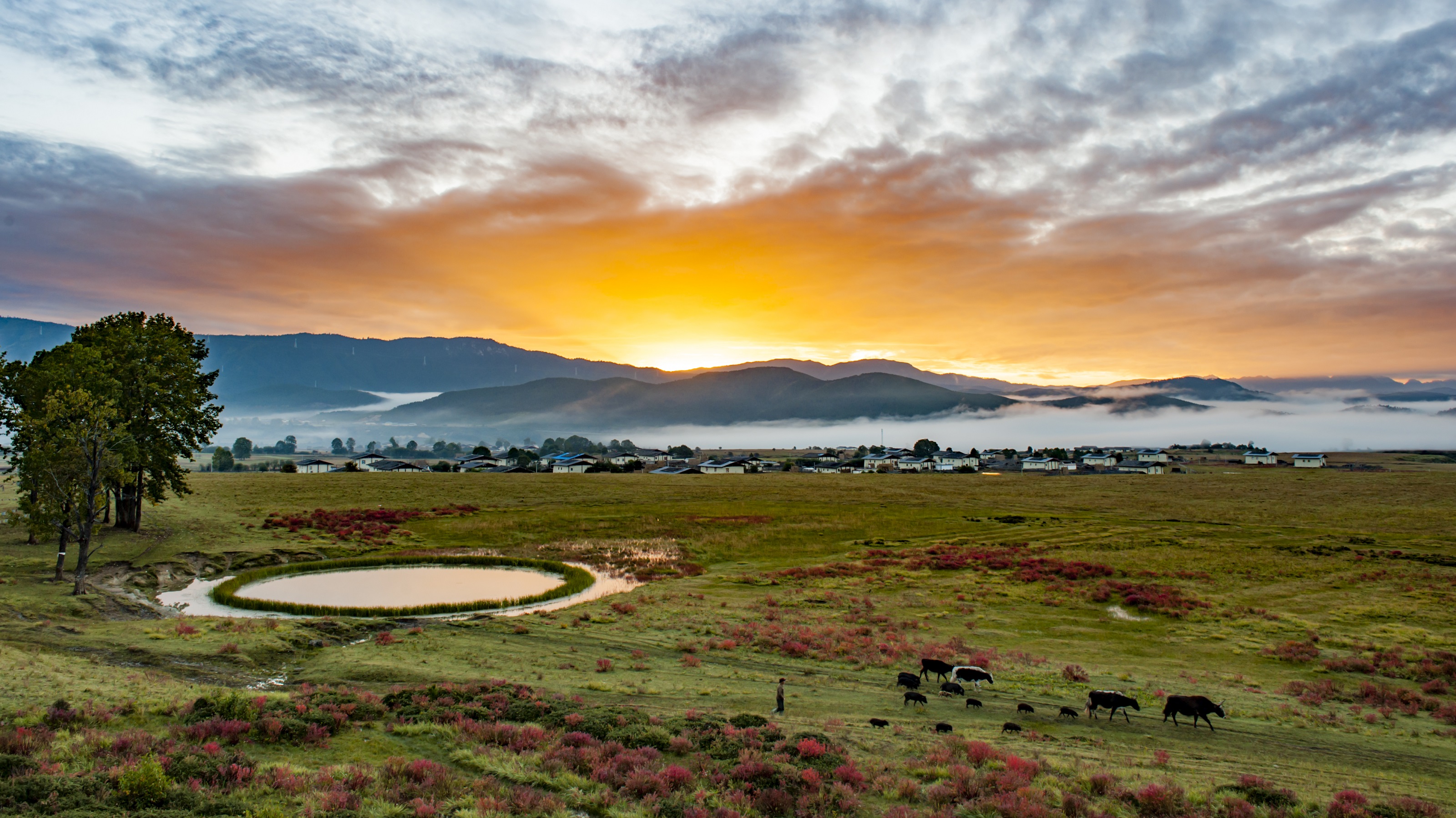 金秋時節(jié),小中甸就換上了絢麗的秋裝,火紅的狼毒花鋪滿了整個草原,與五彩繽紛的森林交相輝映,絢麗奪目。