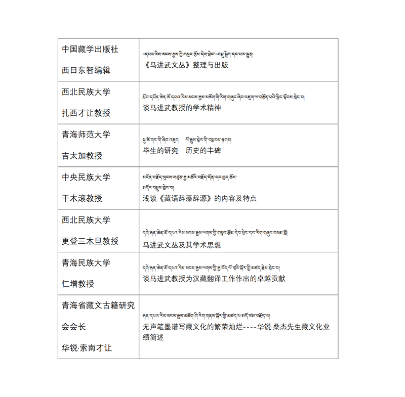 中國藏學(xué)研究中心原副總干事洛桑靈智多杰,青海省省志辦原總編、藏文古籍研究會名譽(yù)會長謝佐,西北民族大學(xué)科研處副處長英加布,甘肅省藏學(xué)研究學(xué)會副會長傅千吉,宗拉昌瓦公司總經(jīng)理扎西加等專家學(xué)者對《馬進(jìn)武文叢》的學(xué)術(shù)水平和現(xiàn)實(shí)意義給予了高度評價(jià),認(rèn)為該系列叢書不僅體現(xiàn)并傳承了馬進(jìn)武先生的學(xué)術(shù)思想,而且在推動新時(shí)代藏語文研究和藏漢翻譯事業(yè)發(fā)展、促進(jìn)學(xué)術(shù)合作,推動民族語言學(xué)學(xué)科繁榮和進(jìn)步等方面,具有高度的學(xué)術(shù)性和現(xiàn)實(shí)意義。西藏自治區(qū)藏醫(yī)院副院長銀巴研究員、四川民族出版社社長澤仁扎西、青海師范大學(xué)原副校長扎布教授、夏壩·嘉央克珠、甘肅華銳剛乃旦才讓、青海民族大學(xué)旦正教授、青海民族出版社副社長阿寧·扎西東主等對《馬進(jìn)武文叢》的出版發(fā)行表示祝賀。