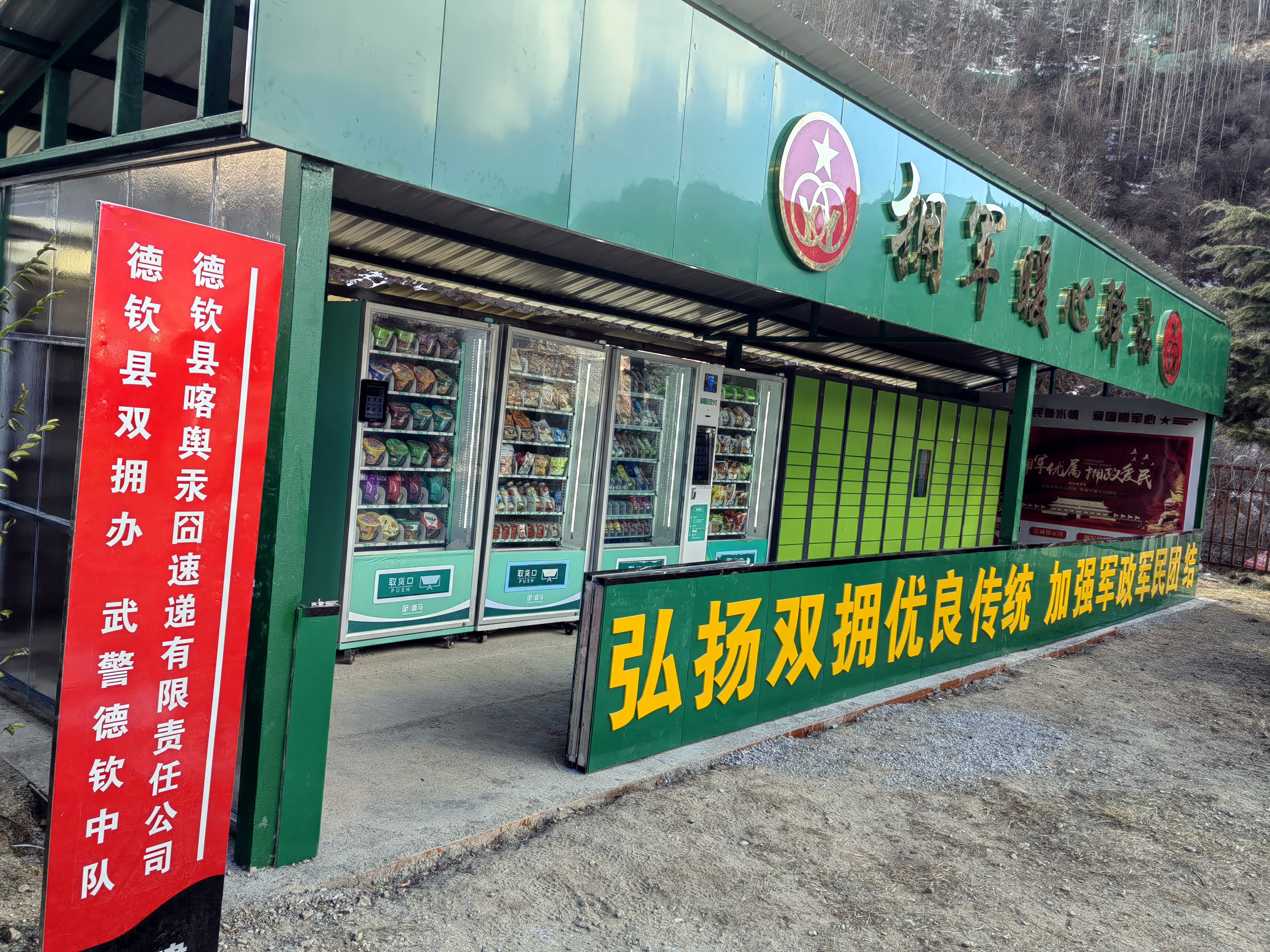 由于武警德欽中隊駐地距離德欽縣城快遞站較遠,收發(fā)快遞成為部隊官兵的一大難題,德欽縣愛心企業(yè)喀輿貢囧速遞有限責任公司了解到情況后,主動聯(lián)系德欽縣雙擁辦,積極伸出援助之手,為擁軍暖心驛站免費贈送一組智能快遞柜,及時將快遞配送至擁軍暖心驛站。如今,部隊官兵只需通過手機掃描快遞柜的二維碼便可自主領取快遞,這一援助之舉實實在在為駐地官兵解決了收發(fā)快遞難題。