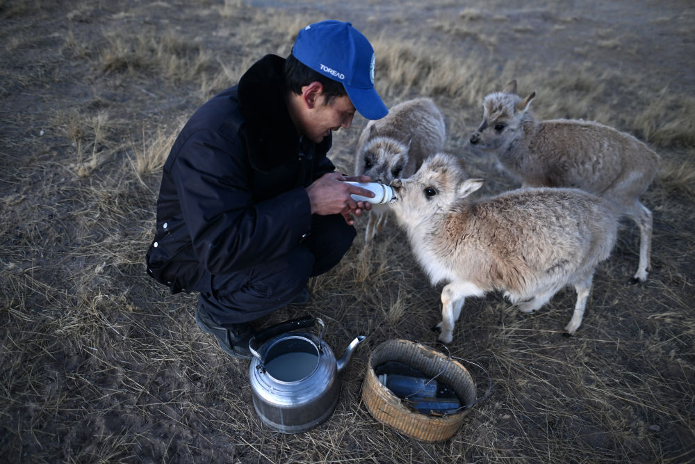可可西里巡山隊(duì)員才文多杰在索南達(dá)杰保護(hù)站內(nèi)給被救助的藏羚羊幼仔喂奶(1月18日攝)。新華社記者 張宏祥 攝