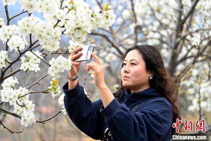 藏族姑娘在梨花林里拍照。記者 安源 攝