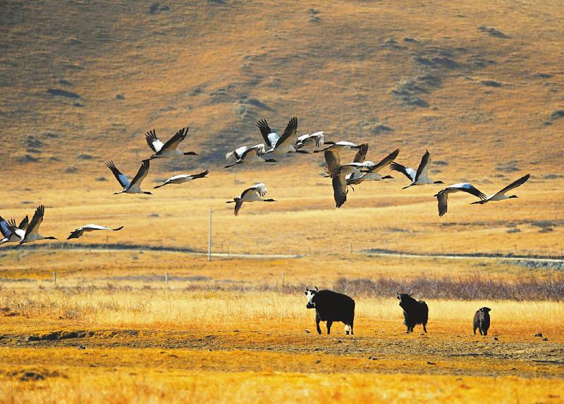 黑頸鶴是世界上唯一生長(zhǎng)、繁衍在高原的鶴類。每年3月中下旬,在云貴高原越冬的黑頸鶴就開始陸續(xù)遷徙到紅原、若爾蓋等地繁衍生息。等到11月氣溫下降,這些黑頸鶴又將再次南遷。