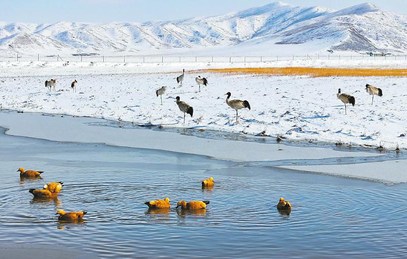 2024年3月1日,第一批飛回來的黑頸鶴出現(xiàn)在大雪后的濕地中。謝宏程 攝
