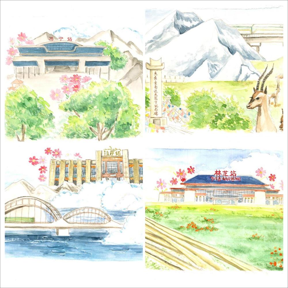 2023年,一組“魅力青藏、幸福天路”的水彩畫讓周源“火出圈”,從西寧站到林芝站,從丹噶爾古城到林芝的桃花林,長長的鐵軌將沿線的景觀特色串聯(lián)起來,構成一幅美輪美奐的天路長圖。