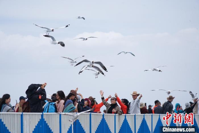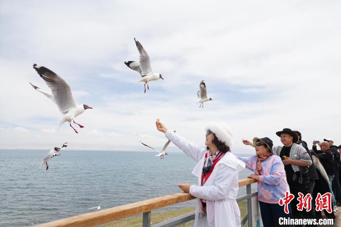 圖為游客在青海省海南藏族自治州共和縣青海湖二郎劍景區(qū)內(nèi)與棕頭鷗互動(dòng)。馬銘言 攝