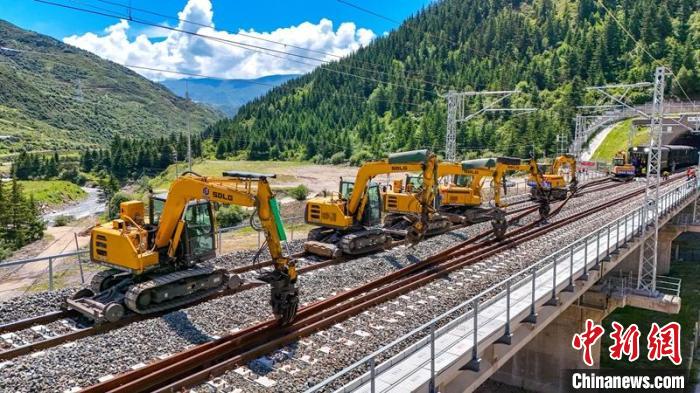 川青鐵路鎮(zhèn)黃段500米長軌鋪設采用“直鋪法”和“換鋪法”相結合的方式組織施工,無砟道床采取“直鋪法”施工,有砟道床采取“換鋪法”施工,利用工具軌鋪通右線,作為工程路料運輸主線,同時兼顧左線鋪軌、長軌焊接鎖定及大機搗固穿插施工作業(yè)。“為確保鋪軌安全有序推進,專門配置了HXN5型高原大功率內燃機車等80余臺(輛)大型設備開展軌道施工作業(yè)?!睆埲A稱,期間項目部合理分配資源,5天完成100公里長鋼軌鋪設,12天完成100公里無縫線路單元焊接及放散鎖定工作。