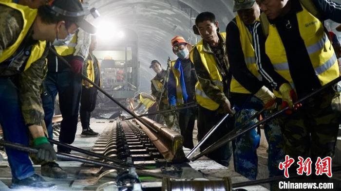 川青鐵路鎮(zhèn)黃段隧道內鋪軌作業(yè)現(xiàn)場。成蘭鐵路公司供圖