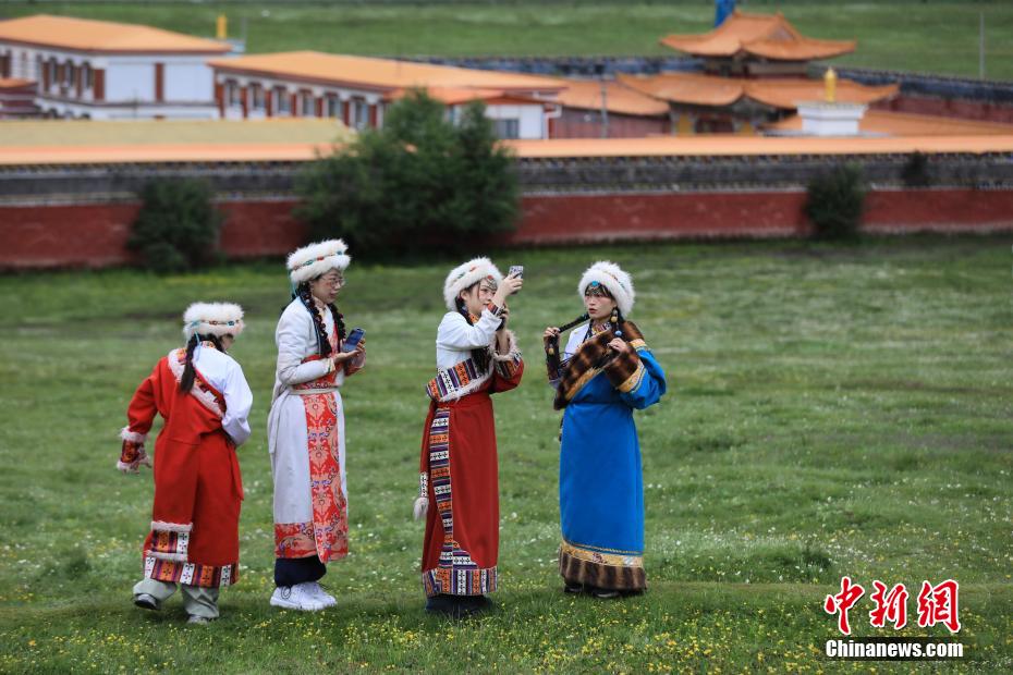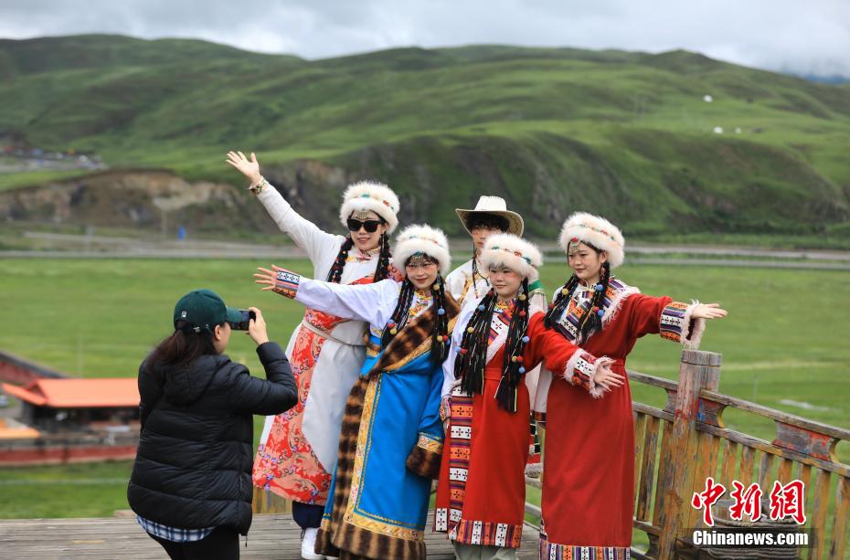 6月28日,游人身著民族服飾在草原上拍照游玩。中新社記者 王磊 攝