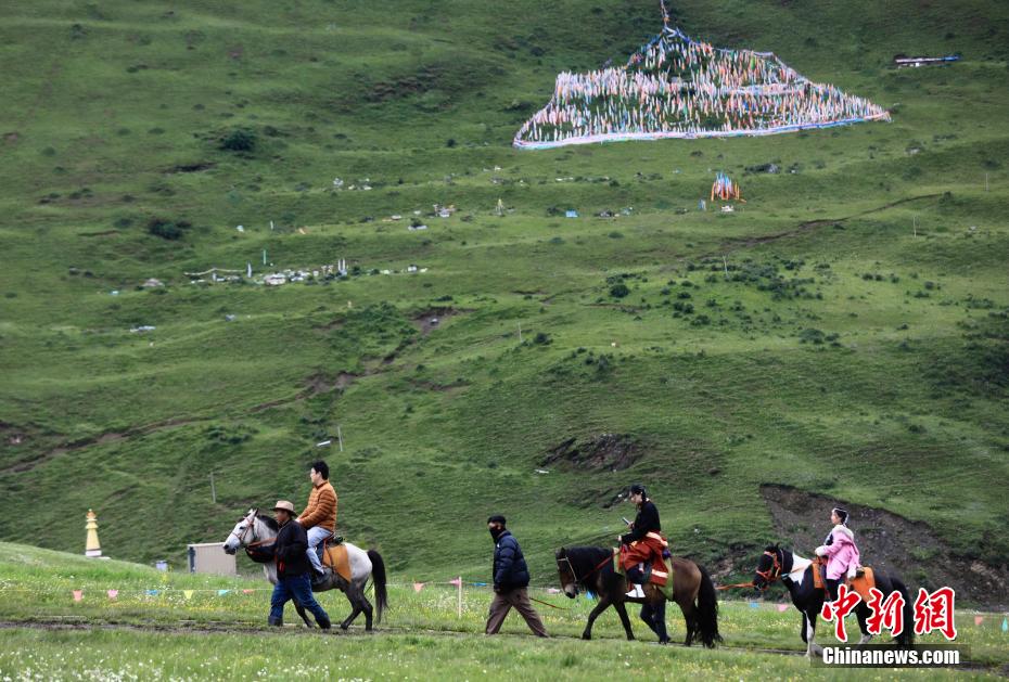 6月28日,游人騎馬走在草原上。中新社記者 王磊 攝