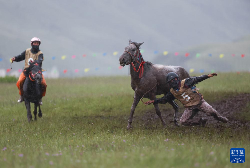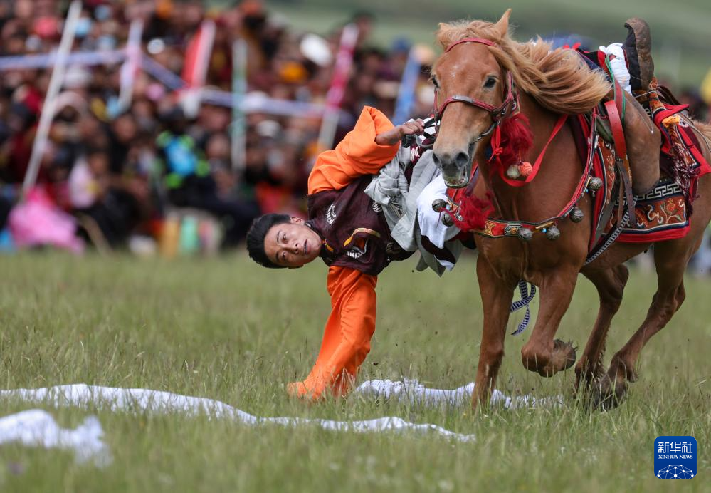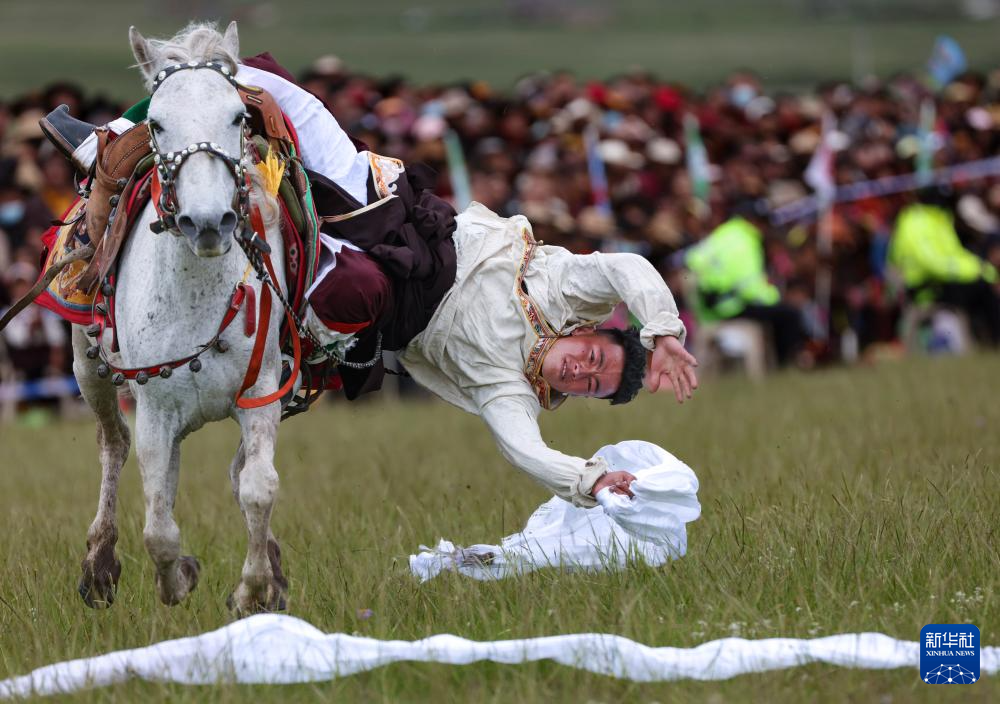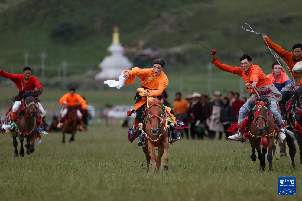 7月28日,當?shù)厝罕娫趨⒓域T馬拾哈達比賽。新華社記者 江宏景 攝