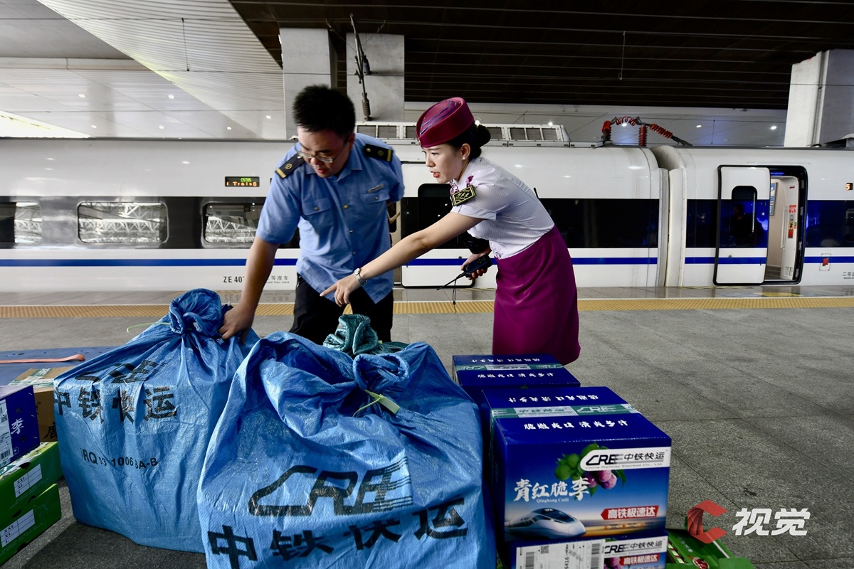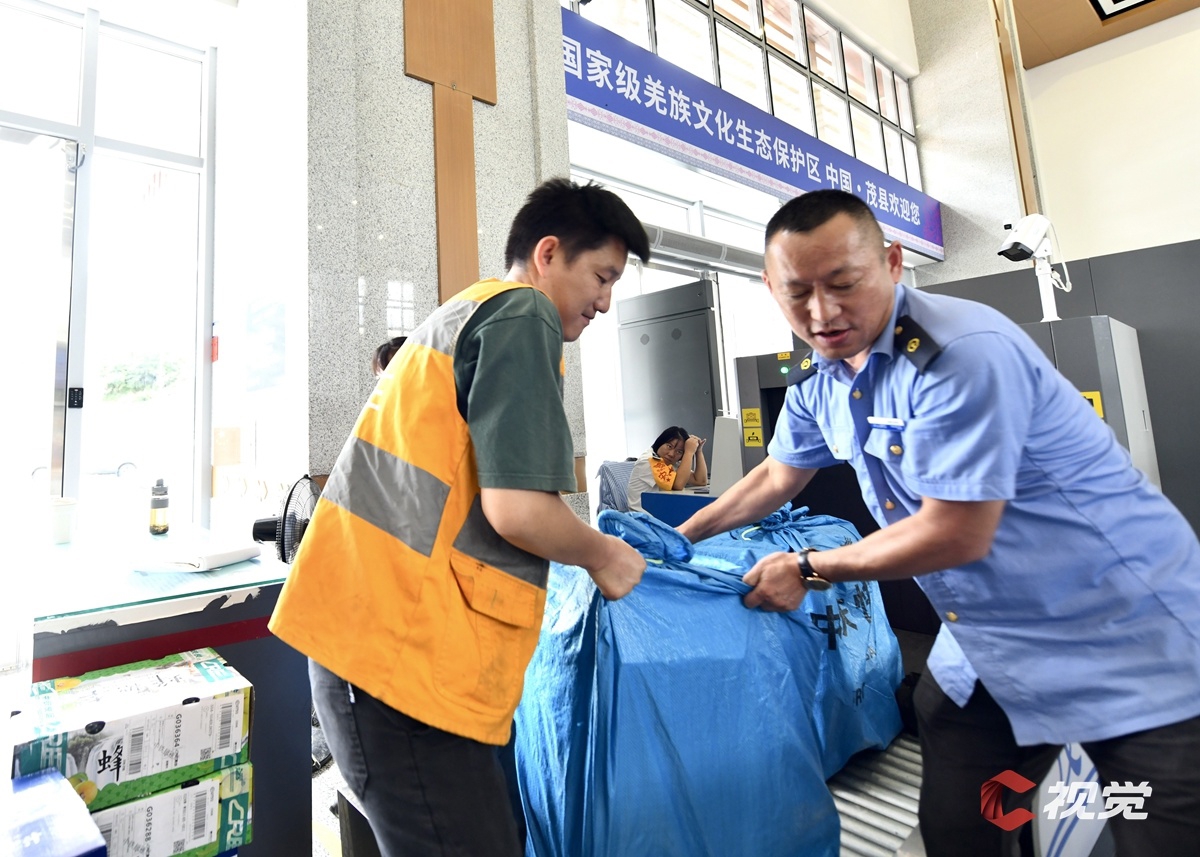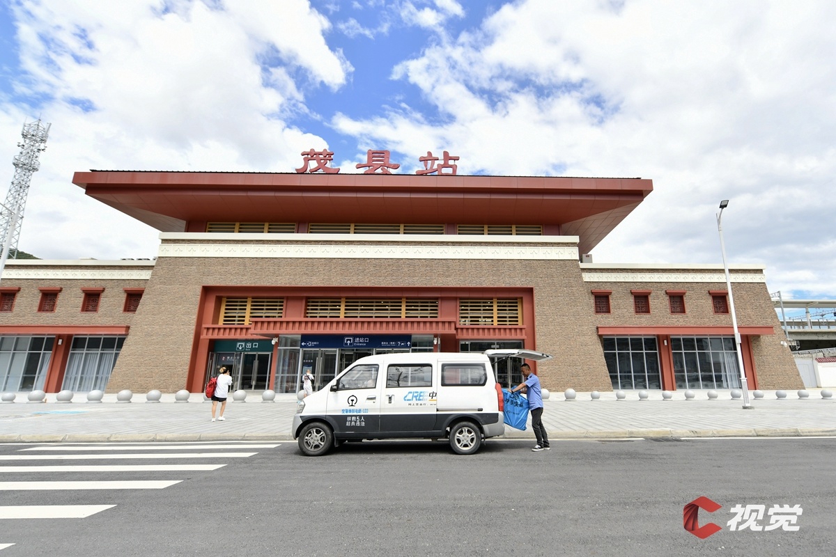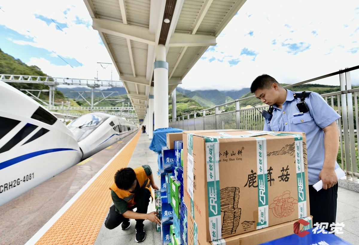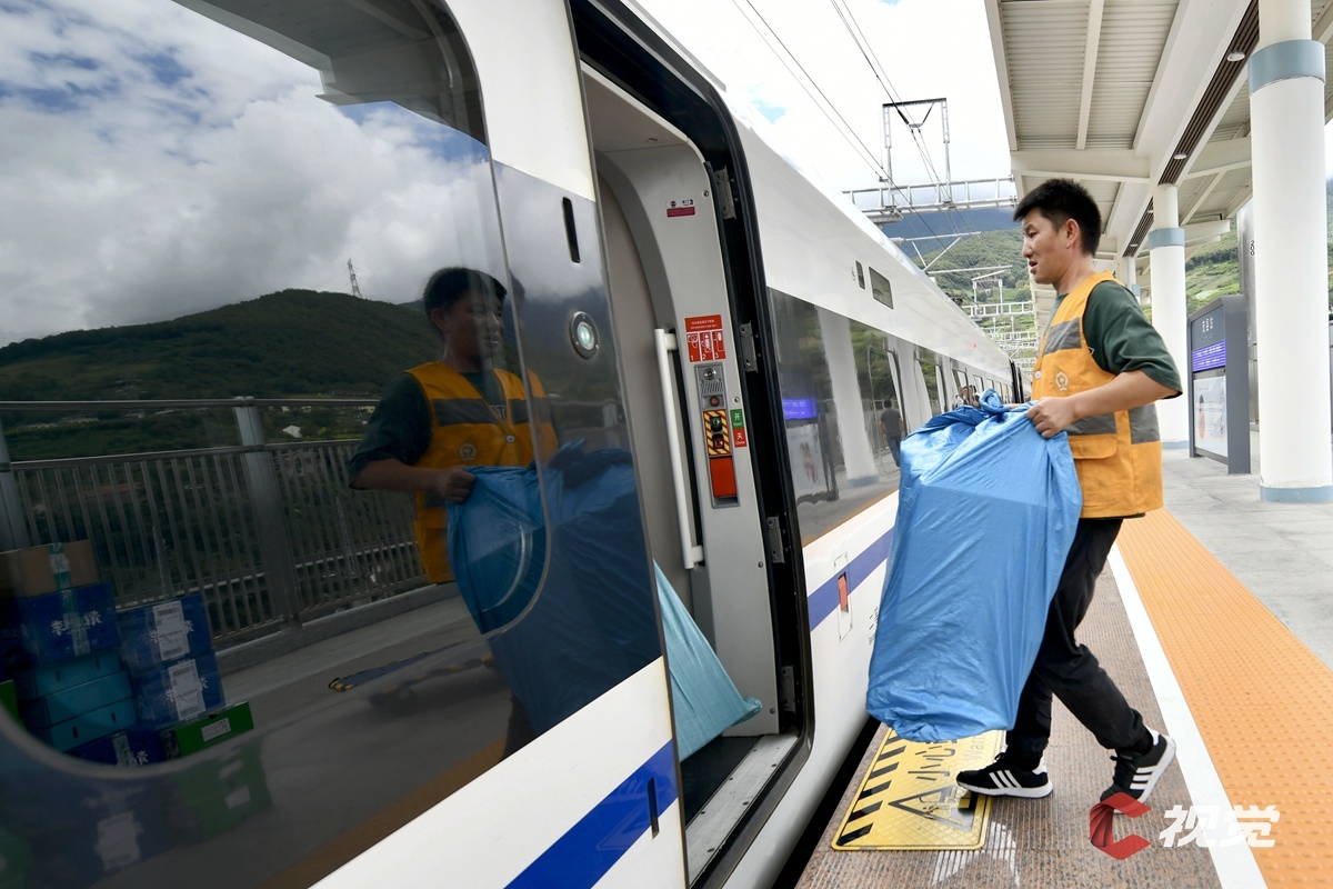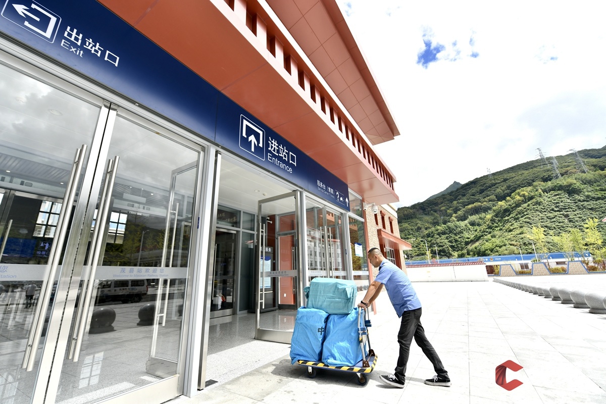 隨著8月30日川青鐵路鎮(zhèn)江關(guān)至黃勝關(guān)段首趟動車開行,高鐵快運業(yè)務(wù)也在茂縣站同步開通辦理,這是川青鐵路成都東至黃勝關(guān)段首次面向沿線客戶受理高鐵快運業(yè)務(wù)。9月10日,中鐵快運成都分公司茂縣站營業(yè)部的工作人員將貨物有序裝車送至茂縣站,經(jīng)過安檢后,這些貨物被搬上松潘開往峨眉山的C5788次列車,最終送達(dá)成都東站。