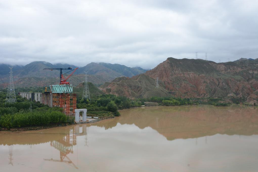 雨后空氣清新,兩岸的樹林里傳出啾啾鳥鳴,黃河水在這里轉(zhuǎn)過一個大彎,緩緩向東流去,在水流平靜的河灣上,正在施工的淺藍色鋼拱橋倒映在水面上,與周圍的青山綠水共同構(gòu)成一幅和美畫卷。