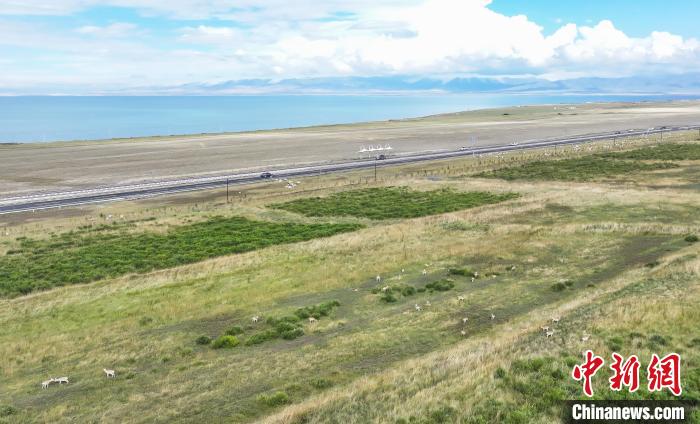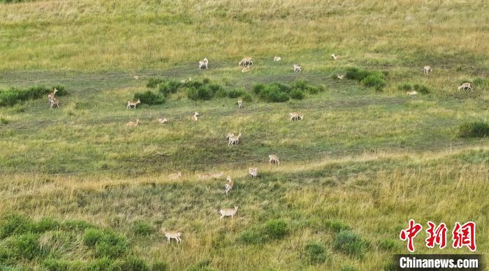 圖為普氏原羚在青海湖畔棲息覓食,悠閑愜意。(無(wú)人機(jī)照片)中新社記者 馬銘言 攝
