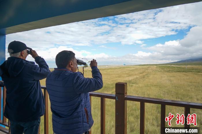 圖為尼泊爾媒體考察團(tuán)成員在青海湖國(guó)家級(jí)自然保護(hù)區(qū)南岸保護(hù)站用望遠(yuǎn)鏡觀察普氏原羚。中新社記者 馬銘言 攝