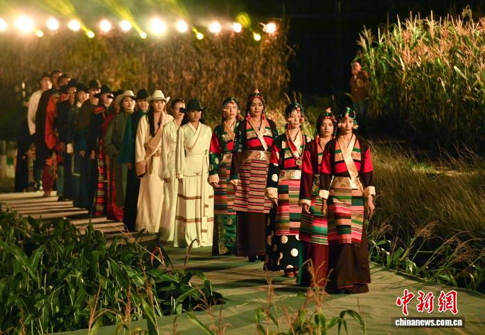在四川省甘孜藏族自治州鄉(xiāng)城縣青德鎮(zhèn)白龔村,玉米田間的一塊空地被改造成露天T臺。不遠(yuǎn)處,一座座白藏房靜靜矗立于夜色,凝視著這片歡騰的土地。20日晚,一場別開生面的田園“瘋”裝秀,就在這寧靜而熱烈的氛圍中上演。