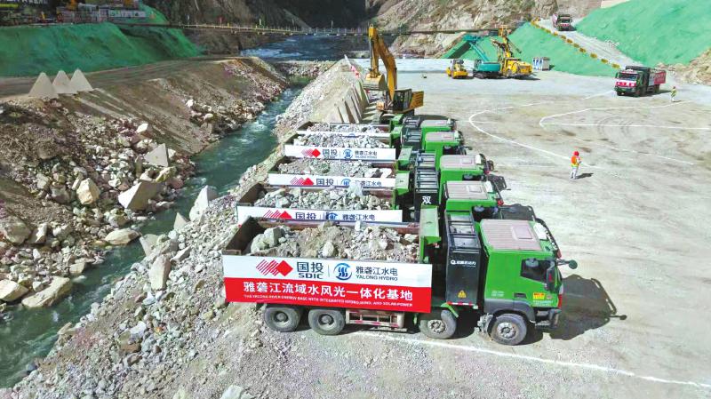 在雅礱江孟底溝水電站截流現(xiàn)場(chǎng),多輛新能源自卸車不間斷地運(yùn)輸石料。(圖片由雅礱江流域水電開發(fā)有限公司提供)